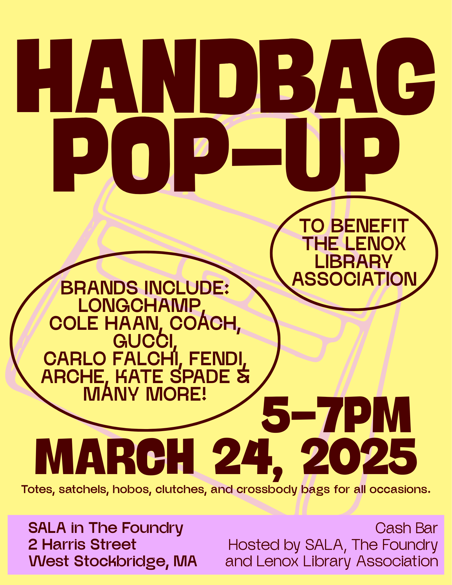 Join us at SALA in West Stockbridge for a special pop-up handbag sale! Proceeds benefit the Lenox Library Association, supporting library programs, materials, and services for our community. Browse a wide selection of styles, colors, and sizes — and find your next favorite bag while supporting a wonderful cause!